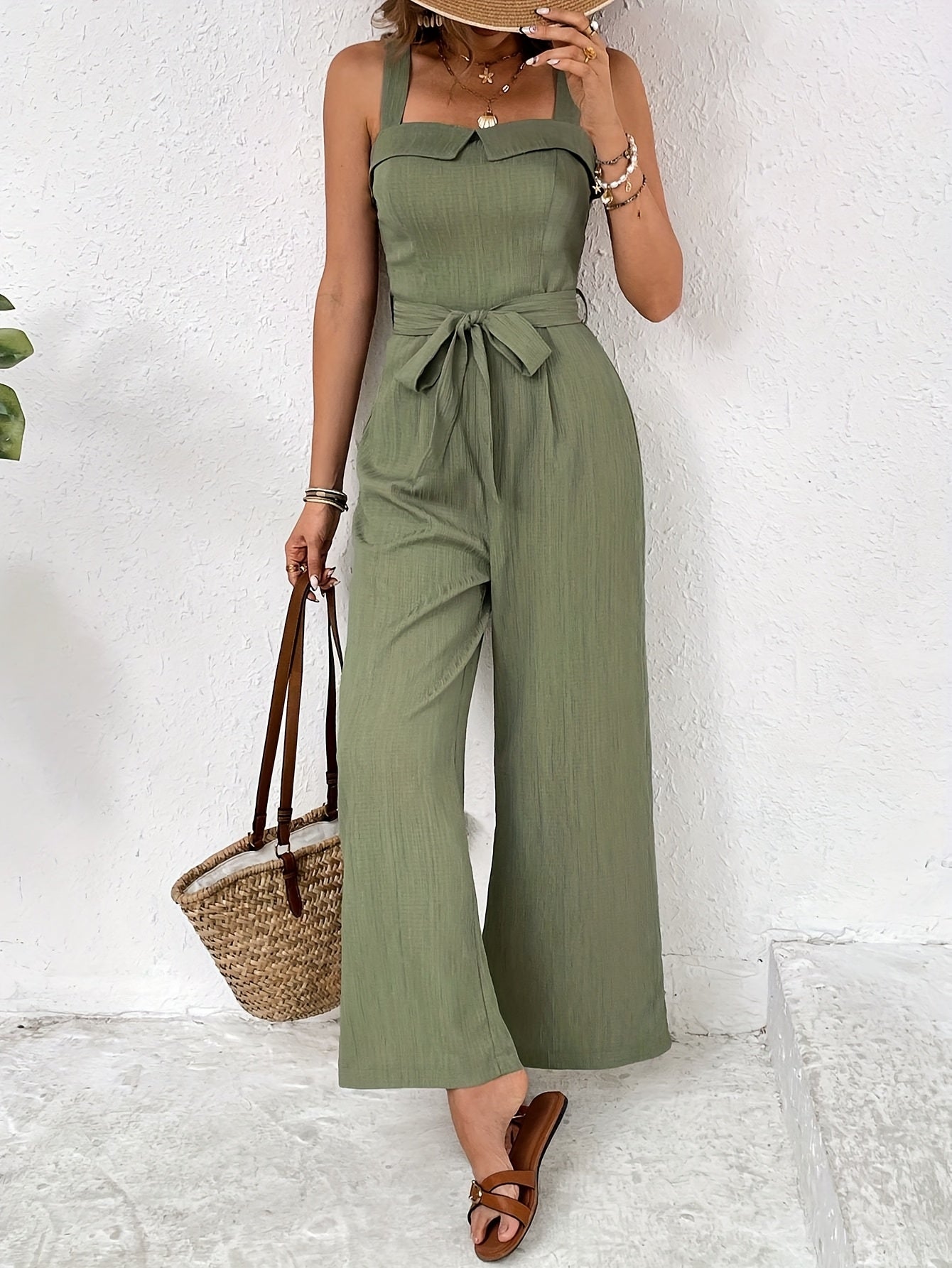 Elevate your wardrobe with the Women's Sage Green Wide-Leg Jumpsuit, designed for comfort and style. Made from 100% polyester, this jumpsuit boasts a stunning strappy back and a belted waist, making it a chic choice for any spring, summer, or fall occasion.