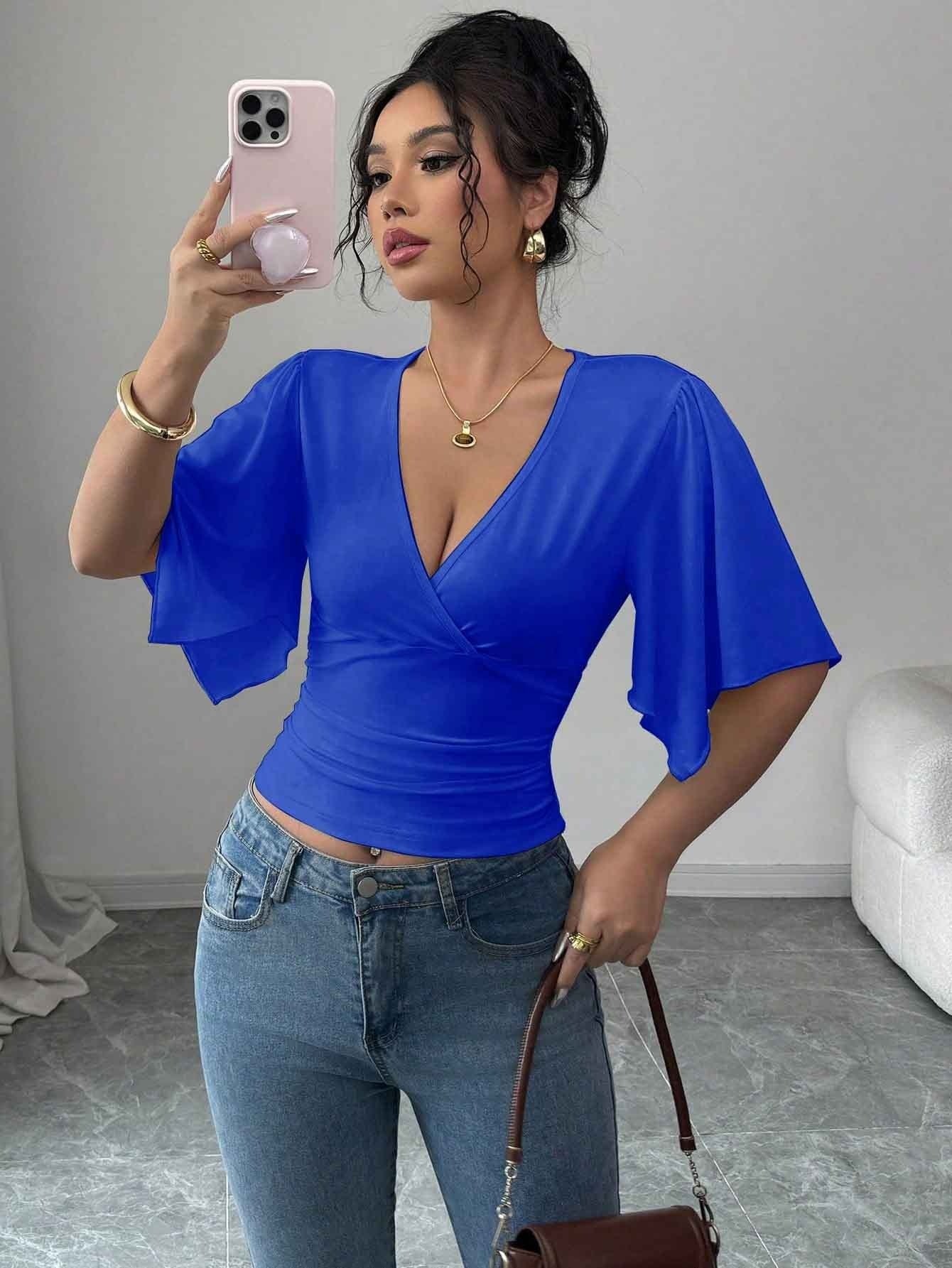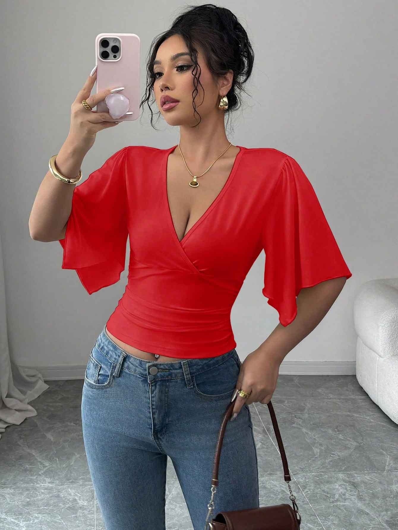 Elevate your style with this stunning fitted V-neck T-shirt that seamlessly transitions from day to evening. The flowing fabric design ensures a stylish finish, while its versatility means you can dress it up or down effortlessly. Don't miss out on this must-have piece for your seasonal wardrobe.