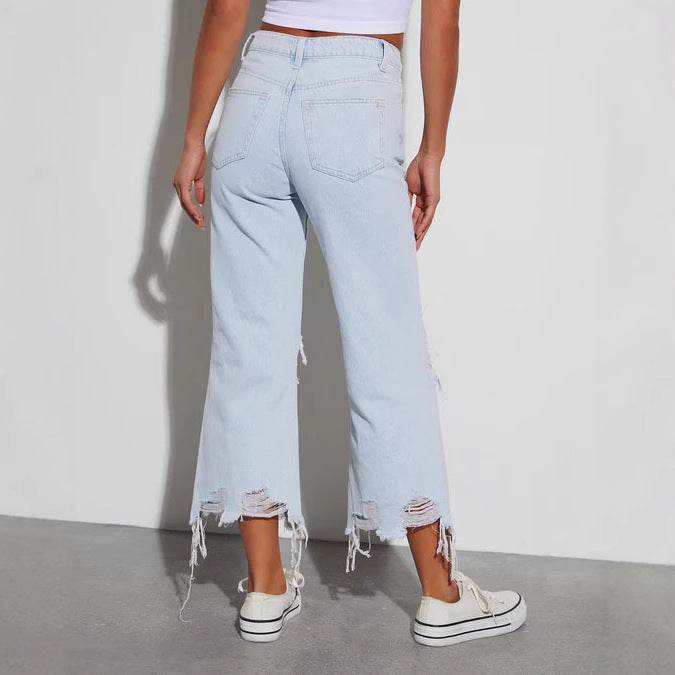 Women's Ripped Cropped Jeans - Casual Loose Fit, Mid Waist Style