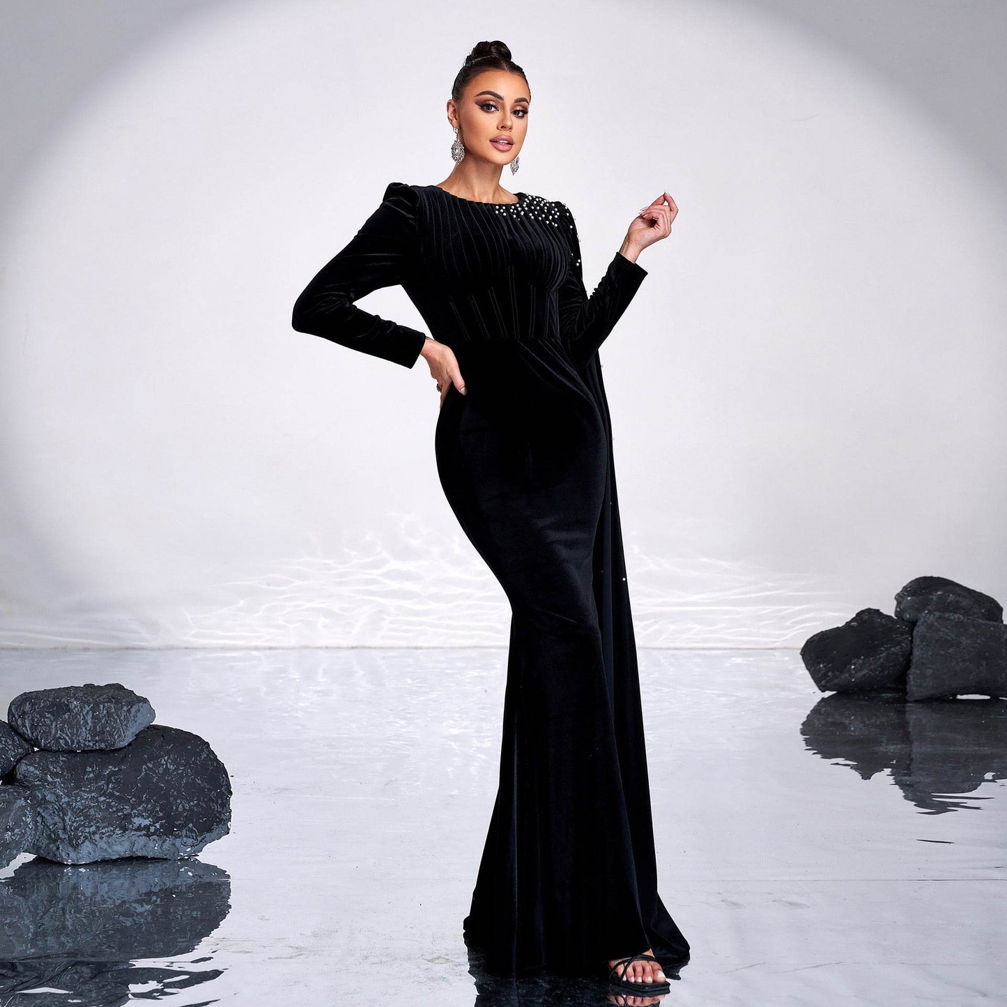 Elegant Velvet Round Neck Dress - Long Sleeve Rhinestone Evening Wear