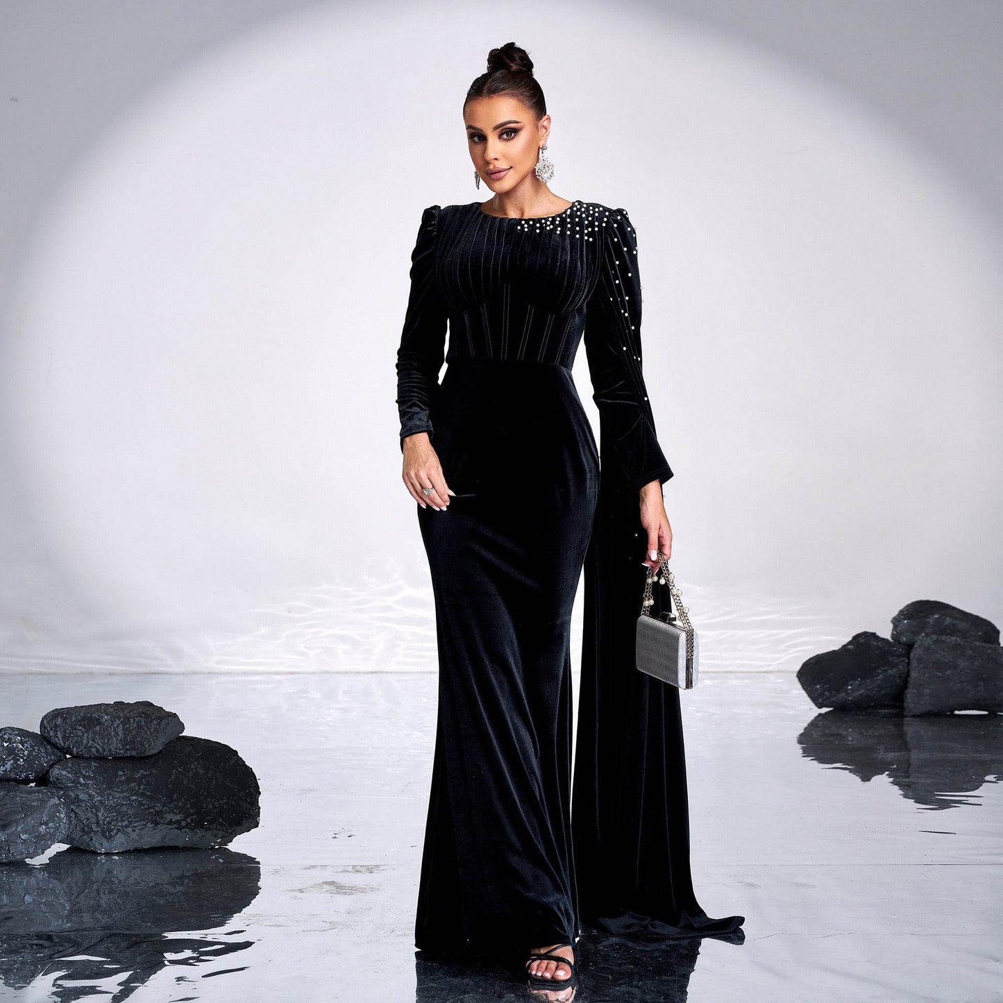 Introducing the Elegant Velvet Round Neck Dress, a stunning long sleeve evening wear piece that exudes sophistication and charm. Crafted from high-quality polyester, this dress features a solid color pattern and a flattering hip skirt design, making it perfect for any special occasion.