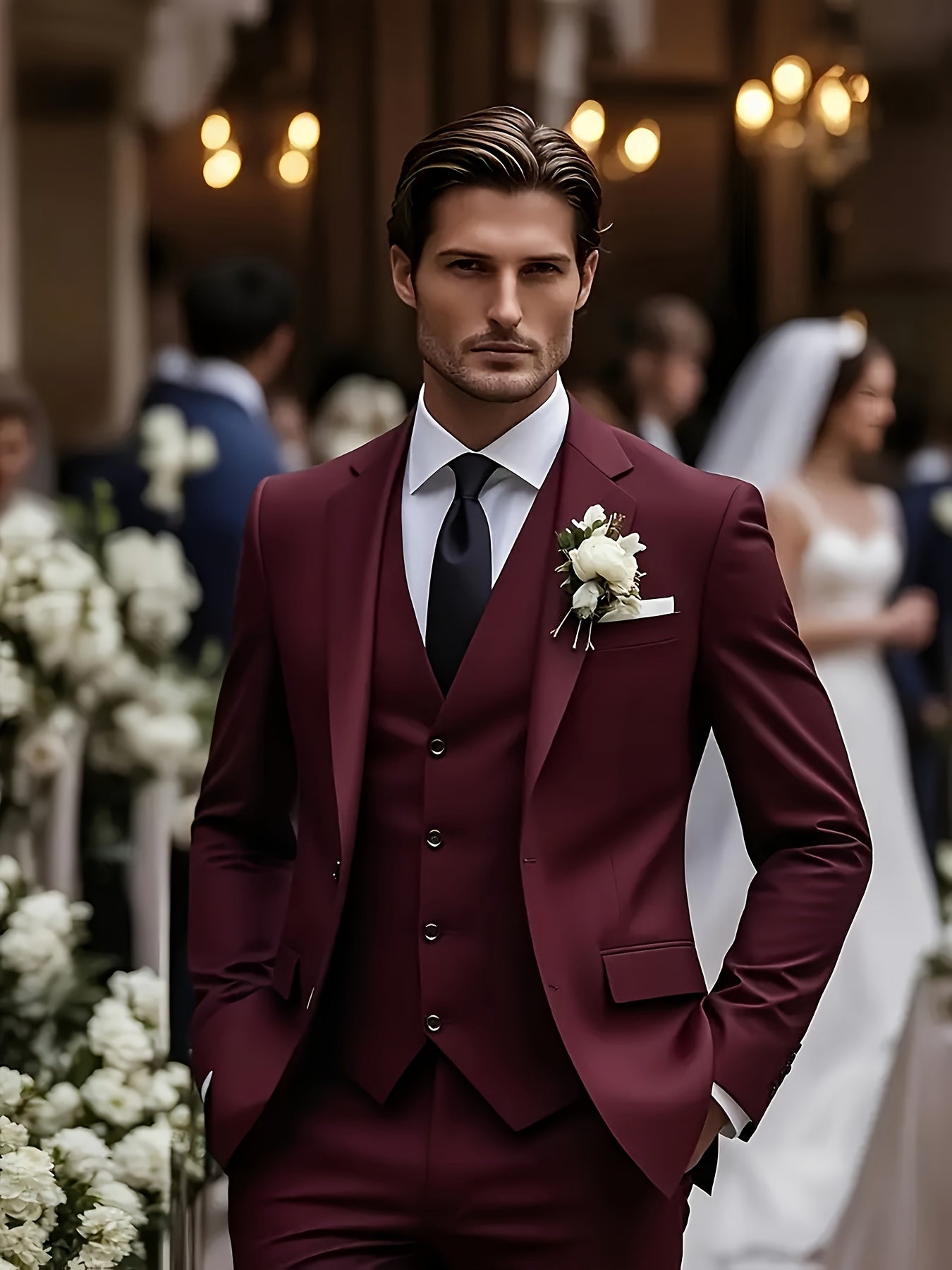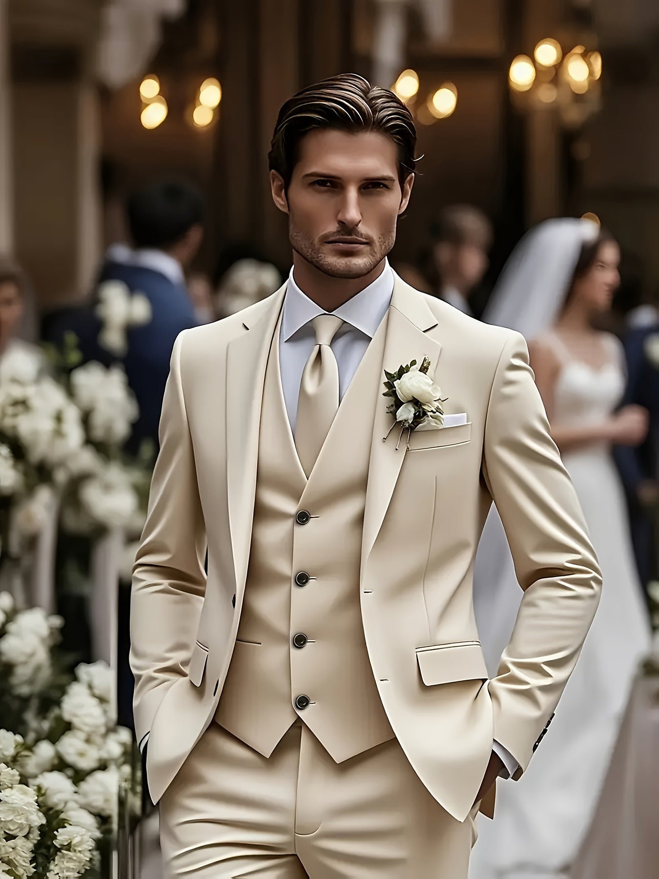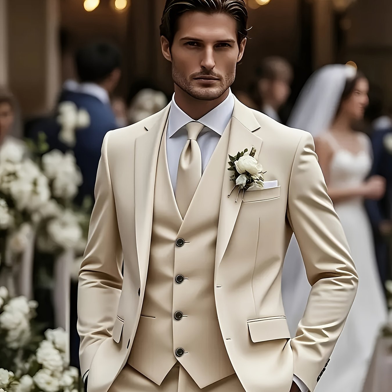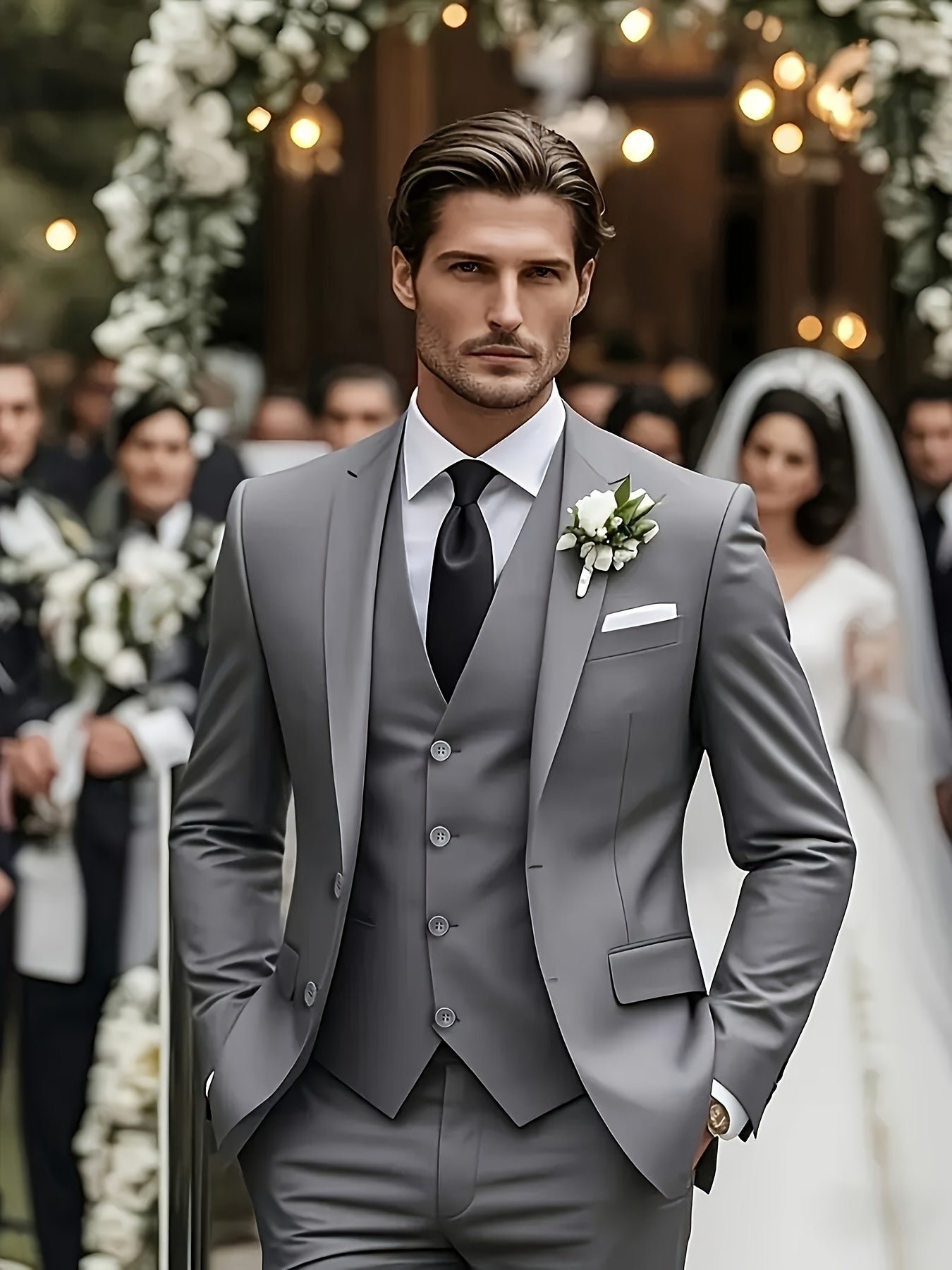 - Includes jacket, pants, and vest for a complete ensemble