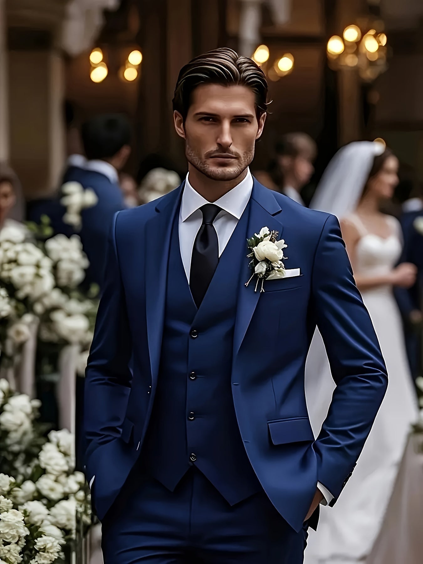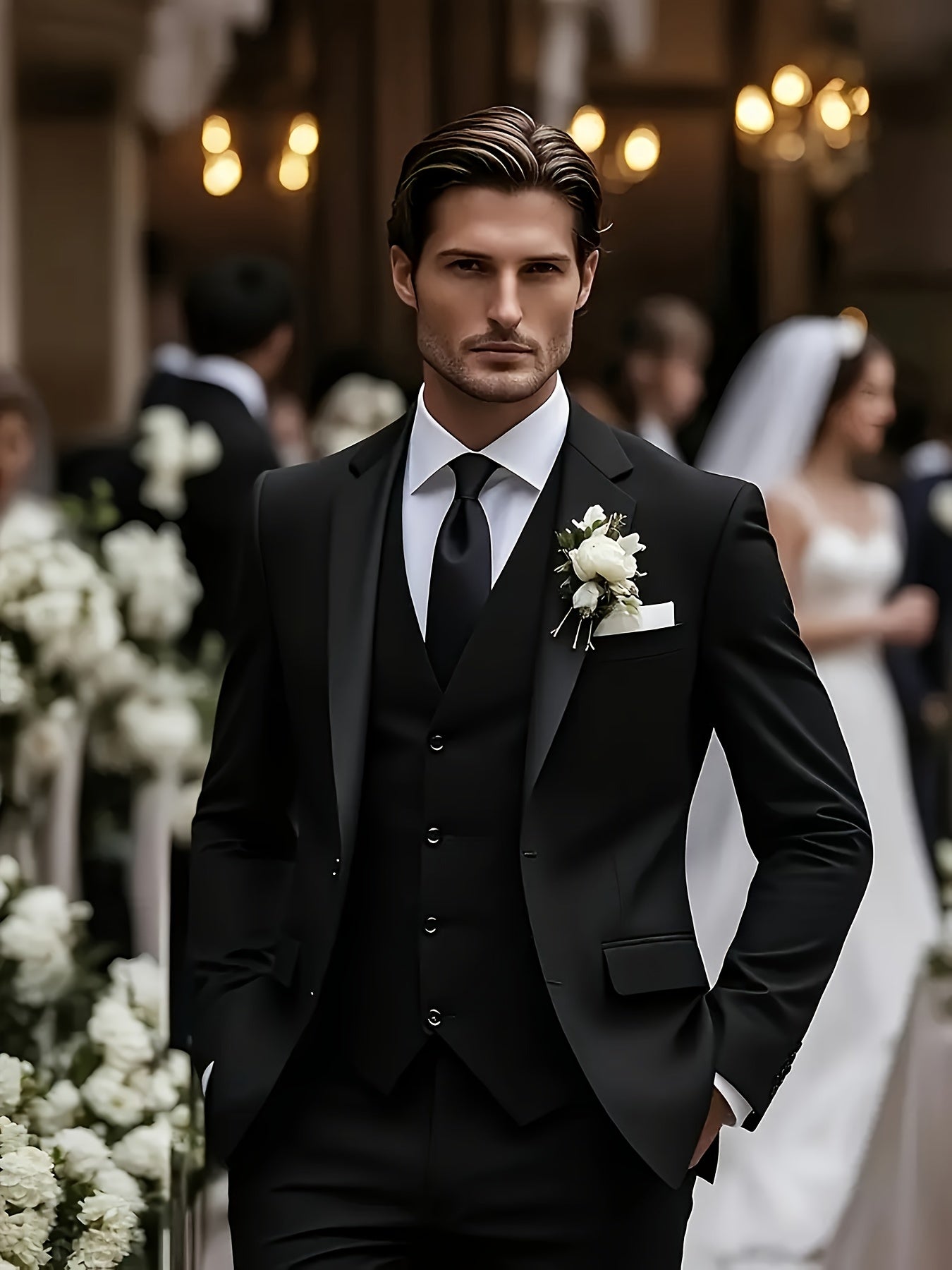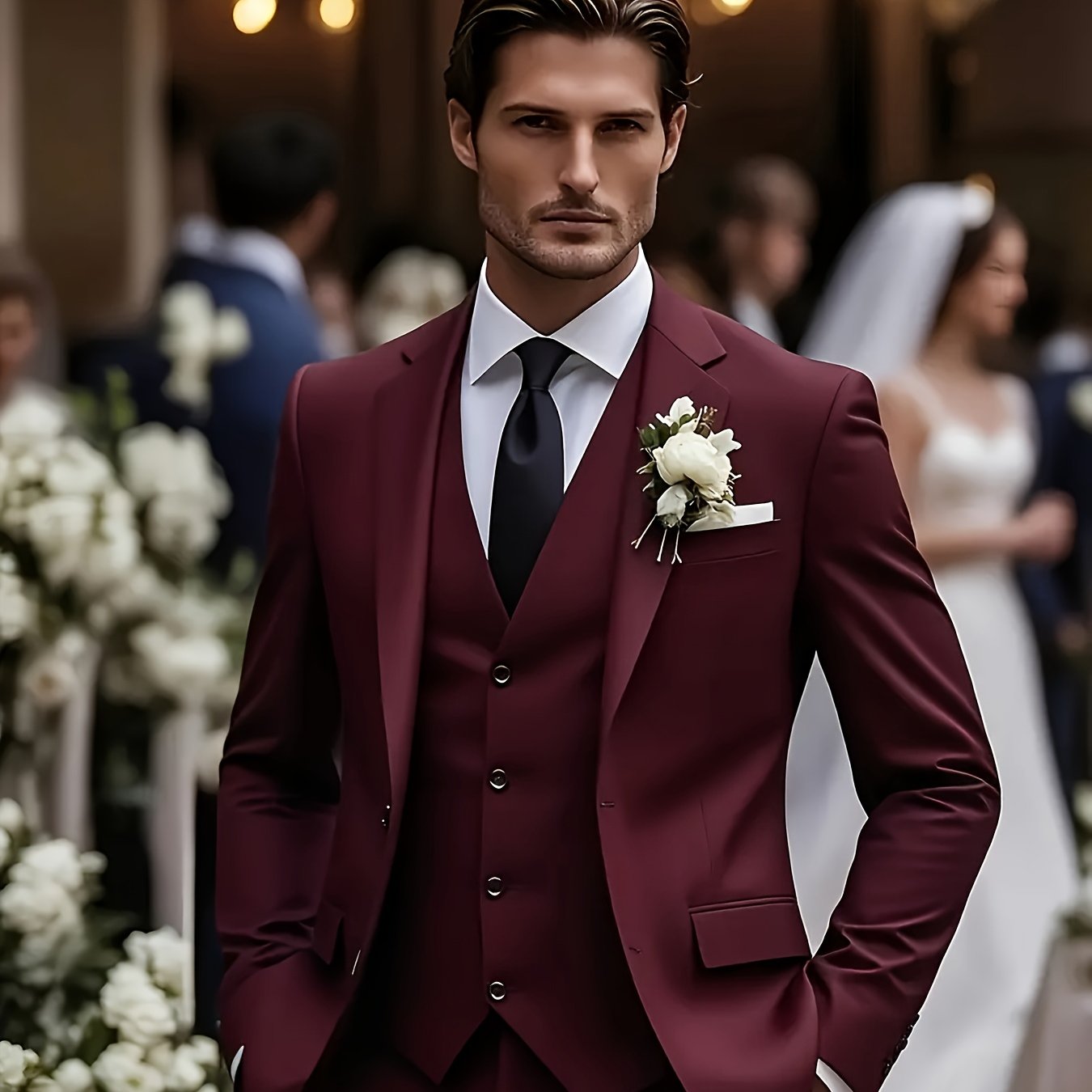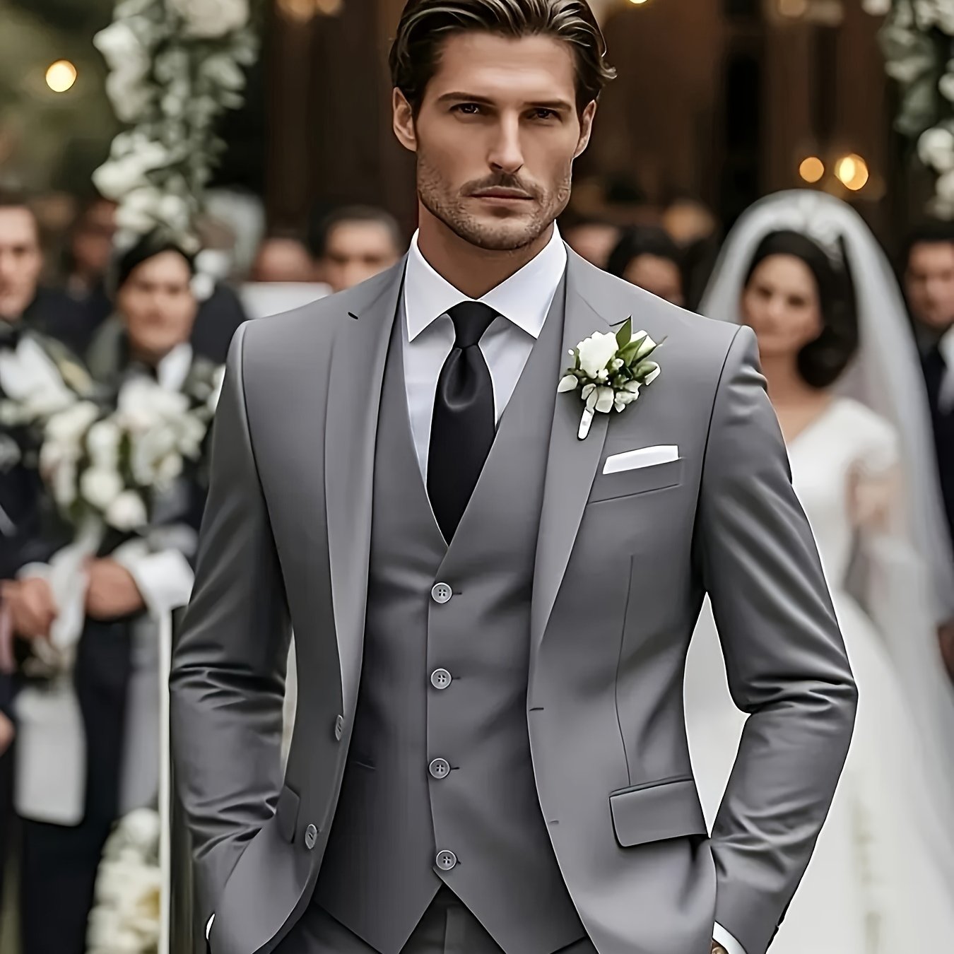 - Includes jacket, pants, and vest for a complete ensemble