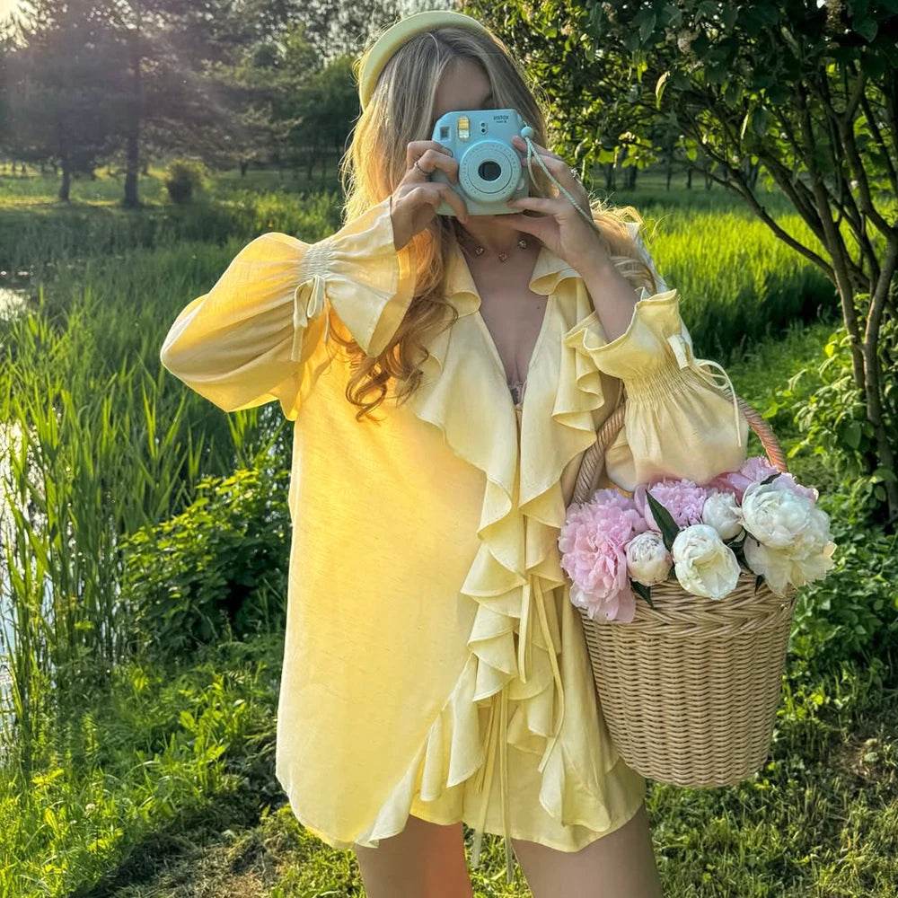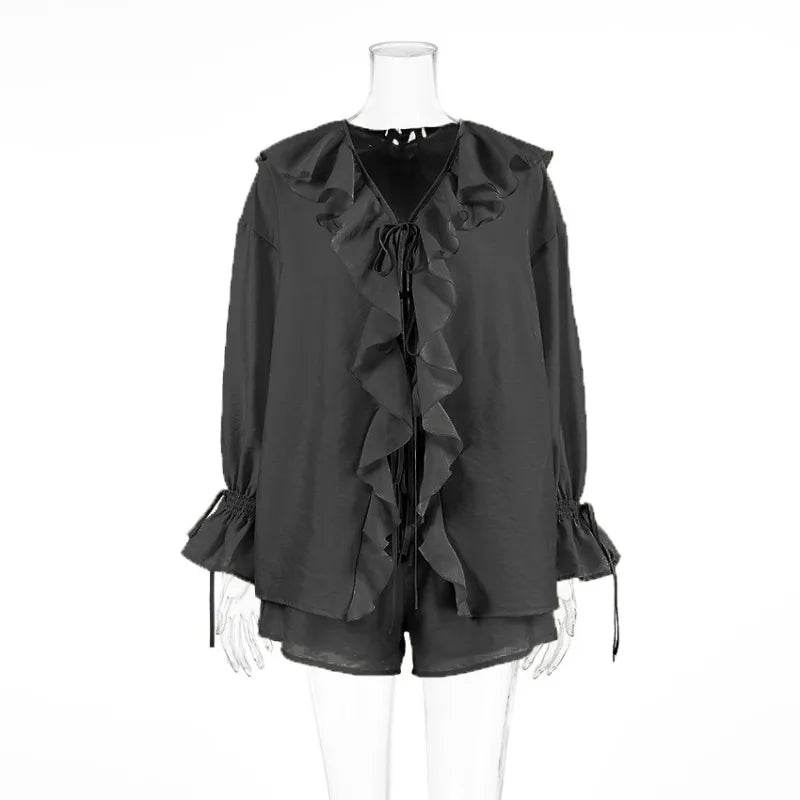 Tuularose Women's Ruffled Tie Top & Shorts Set - Casual Office Style